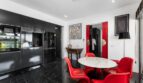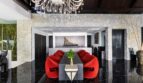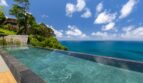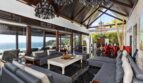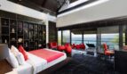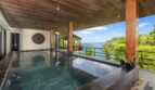 At the heart of Villa Yin is an open plan living and dining pavilion that seamlessly connects indoor elegance with outdoor allure. Soaring dark-wood ceilings, contemporary art pieces, and statement chandeliers define a space that is both dramatic and inviting. The Minotti kitchen and granite dining table set the tone for sophisticated entertaining, while floor-to-ceiling glass opens to a grand marble infinity pool overlooking the sea.
